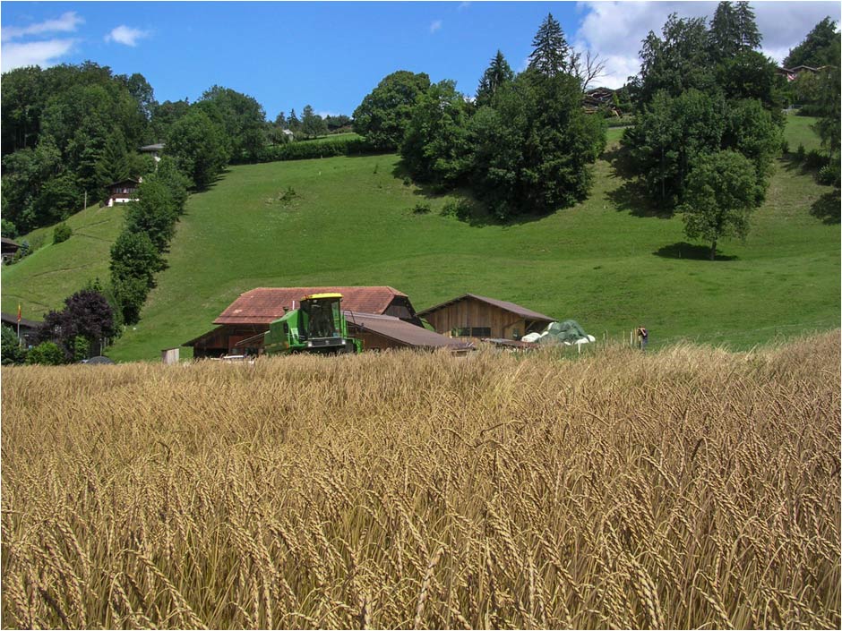 Nebst einigen ha Wald umfasst unser Betrieb 19.5 ha landwirtschaftliche Nutzfläche. Vor allem Naturwiese mit wenig Ackerbau. Mais als Futtermittel für unsere Kühe, und Dinkel als Brotgetreide für unsere Backwaren.